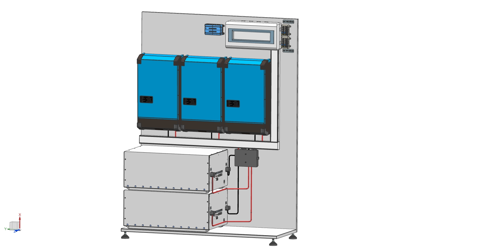 3x Victron MultiPlus-II o łącznej mocy 15kW z chwilowym przeciążeniem do 27kW (zarządza energią, jest awaryjnym zasilaniem jak i ładowarką akumulatora)
