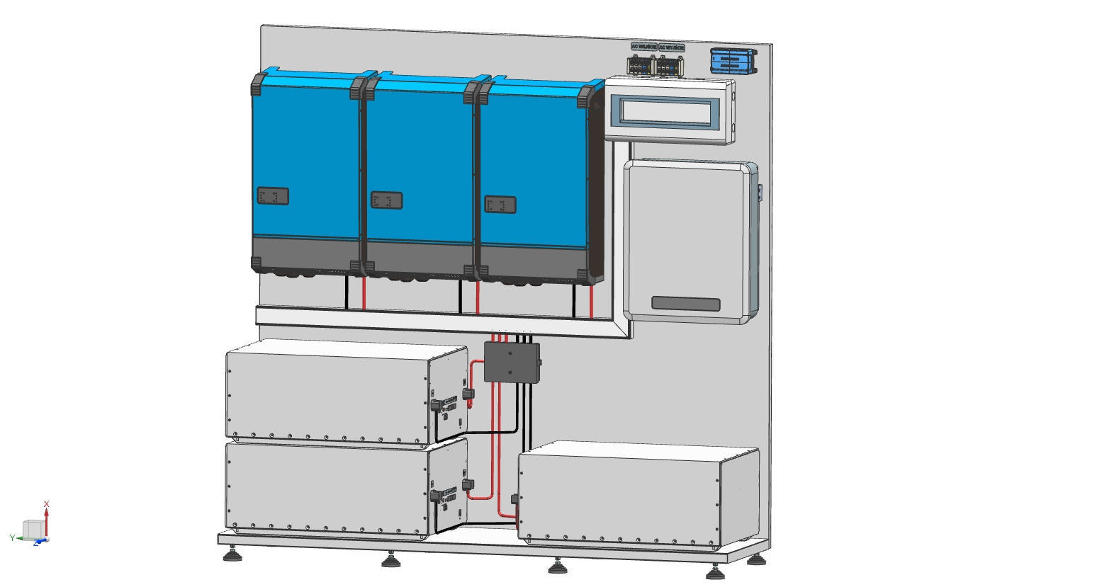 Kluczowym elementem zestawu jest urządzenie Victron MultiPlus-II, które zarządza przepływem energii, zapewniając jej optymalne wykorzystanie, a system jest skonfigurowany i gotowy do pracy. Bardzo prosty w montażu, ponieważ jest tylko jedno wejście, do którego możemy podłączyć sieć lub agregat (jako alternatywne źródło energii do ładowania baterii oraz zasilania obiektu) zaraz po układzie pomiarowym (liczniku energii). Wyjście podłączamy bezpośrednio na całą rozdzielnię instalacji budynku.