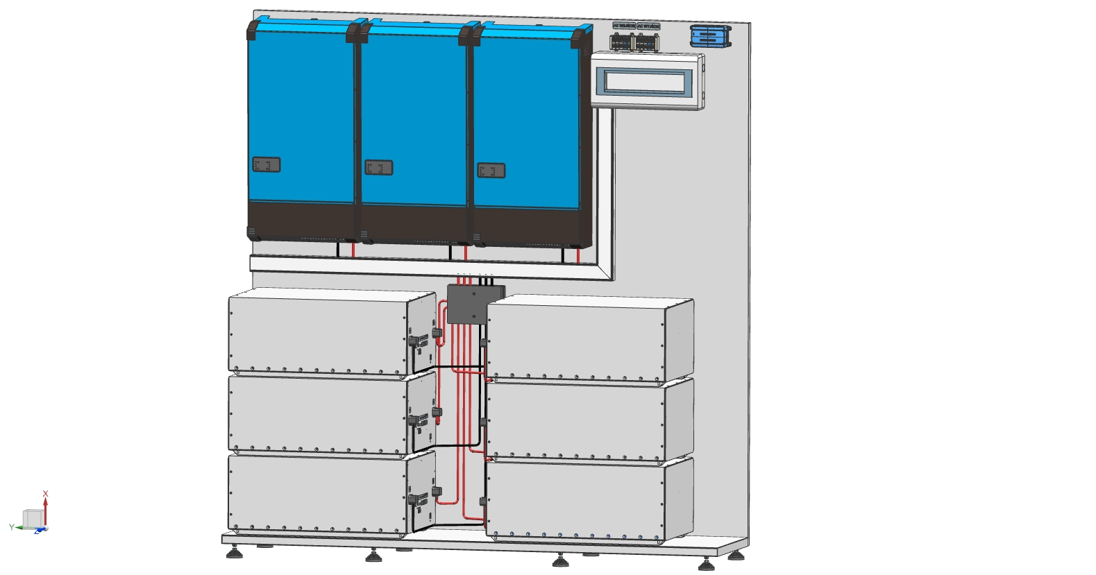 3x Victron MultiPlus-II o łącznej mocy 45kW z chwilowym przeciążeniem do 81kW (zarządza energią, jest awaryjnym zasilaniem jak i ładowarką akumulatora)