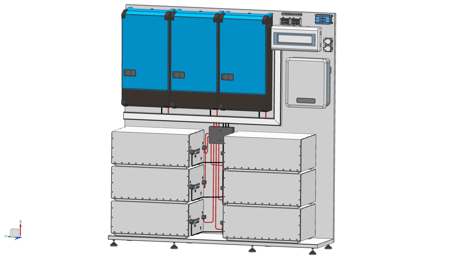 3x Victron MultiPlus-II o łącznej mocy 30kW z chwilowym przeciążeniem do 58kW (zarządza energią, jest awaryjnym zasilaniem jak i ładowarką akumulatora)